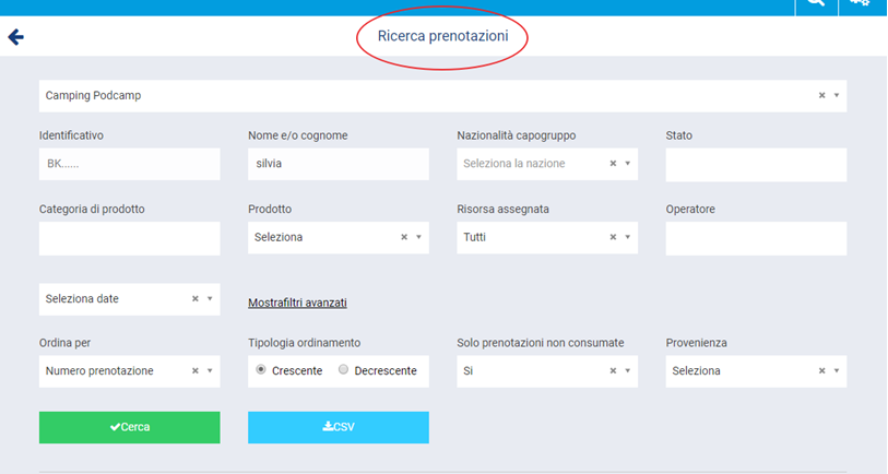 Questa sezione è utile per cercare una prenotazione secondo qualsiasi campo significativo della prenotazione, compresi nome e cognome del capogruppo.