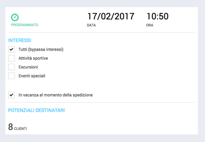 E’ possibile schedulare l’invio di un template di push notification a tutti i dispositivi che hanno effettuato la sottoscrizione ad uno o più interessi.