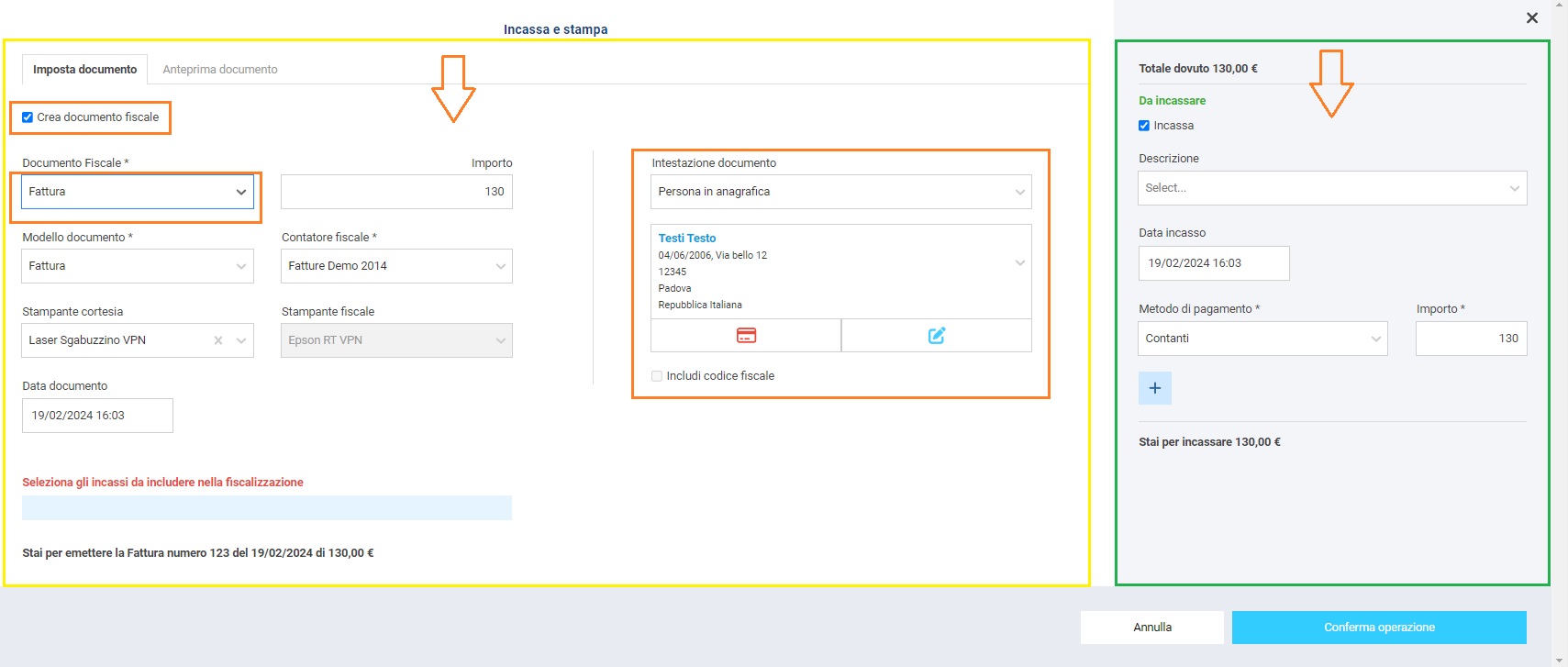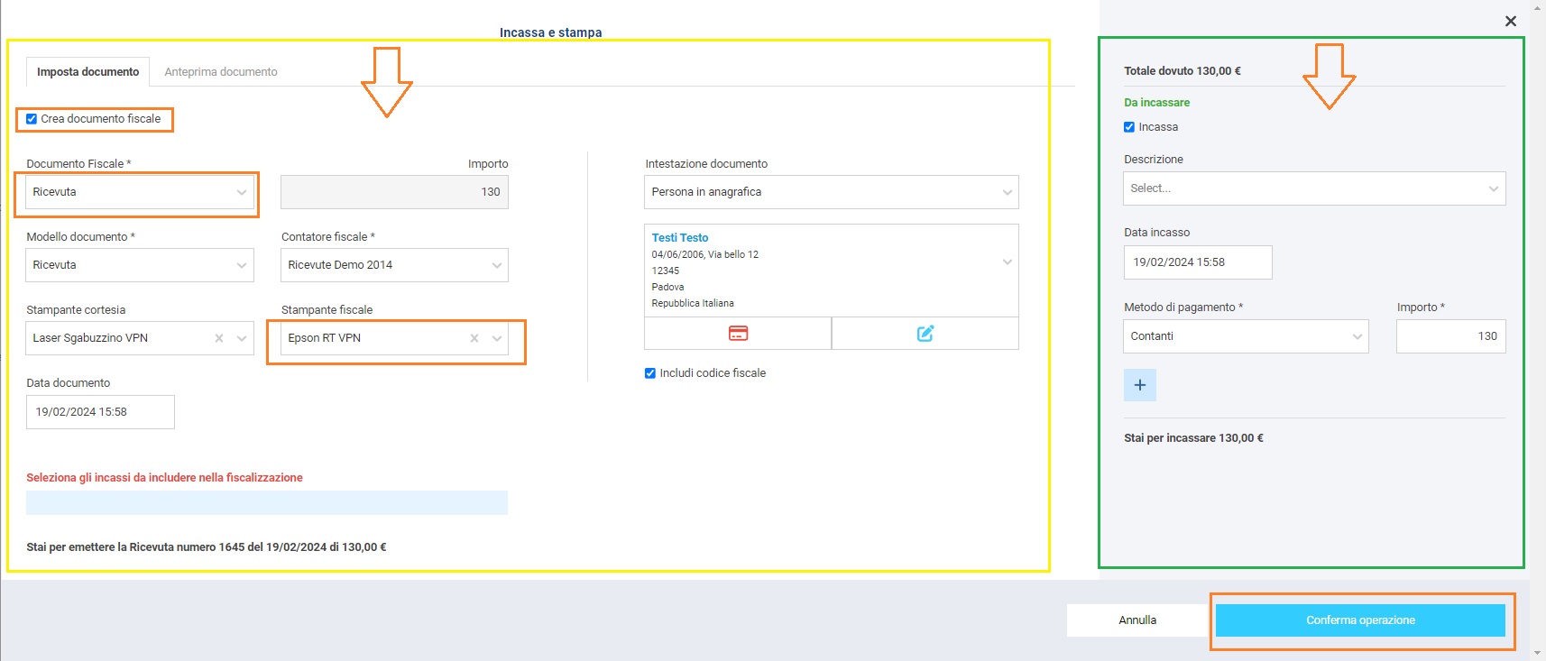 bisogna entrare nella tab del conto della BK → selezionare la riga della caparra → utilizzare il bottone rosso “incassa e stampa” → compilare la sezione dell’incasso → verificare che sia attiva la sezione del “crea documento fiscale” e sia agganciata la stampante fiscale → una volta confermata l’operazione, verrà generato il documento proforma interno e uscirà lo scontrino dalla stampante fiscale.