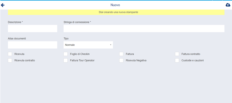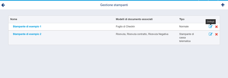 Cliccando sul simbolo “+” in alto a destra, si apre la pagina per l’aggiunta di una nuova stampante (mentre cliccando sul simbolo della matita sul lato destro di ogni riga della tabella di cui sopra, si apre la stessa pagina di modifica della stampante selezionata):